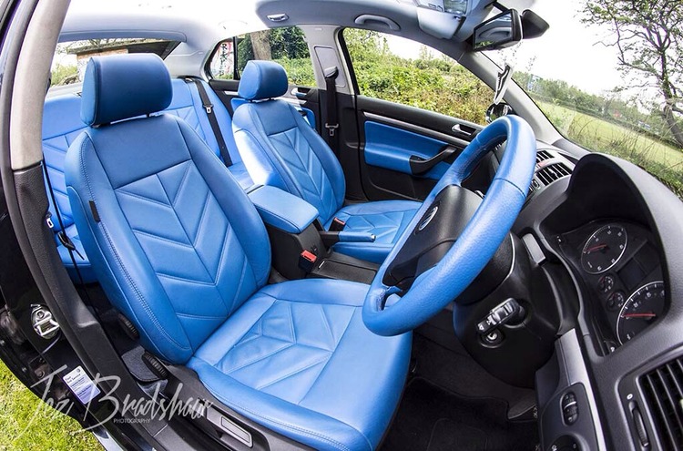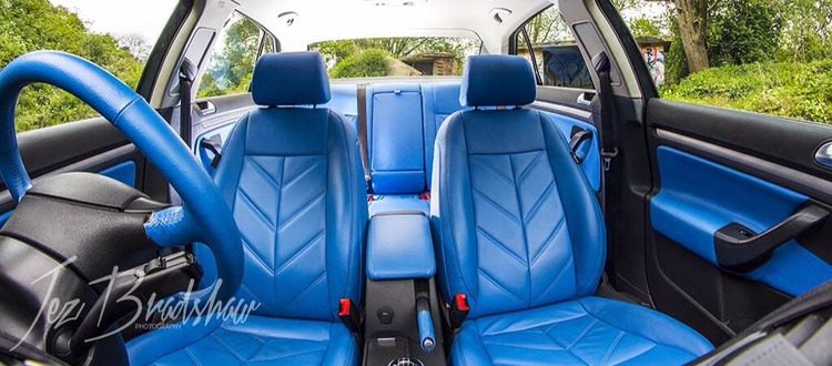 Full Edgeautomotive retrim in blue leather including; seats front and rear, arm rest, door cards, steering wheel, handbrake handle, gear knob and gaiter. Nearly brand new MK6 Golf genuine matts, only used for show use no marks or wear.