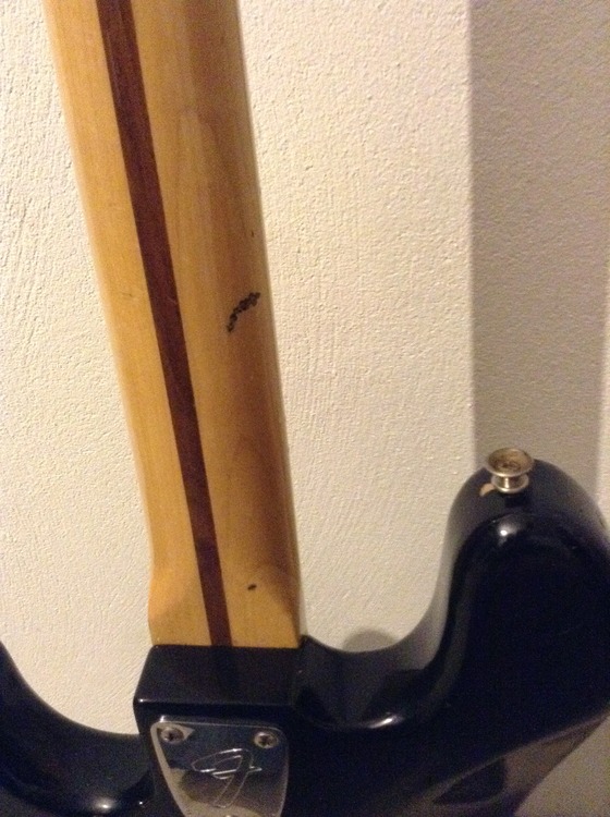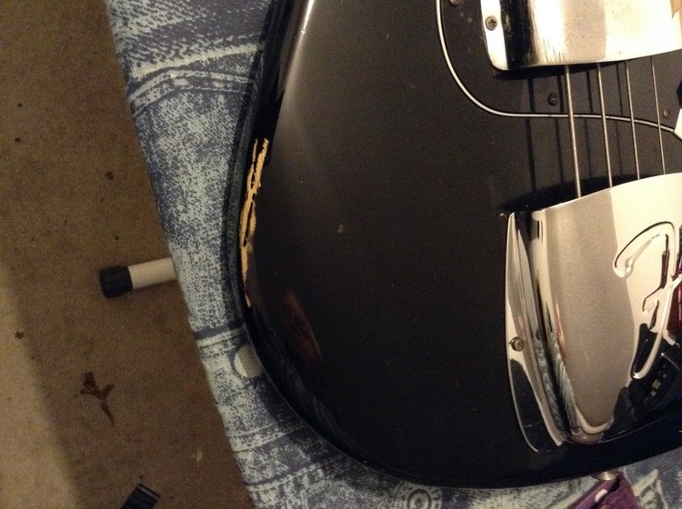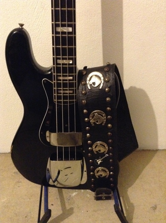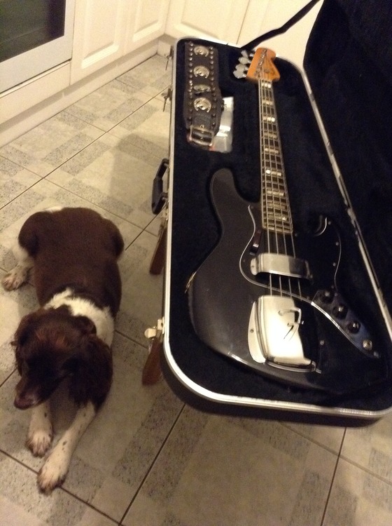 1976 Black Fender Jazz Bass with case. Owned this from new. All original hardware and electronics. Chrome parts in good nick. Superb neck and action. Couple of slight dings (see photographs)but overall good order. according to Fender chat room heads add 10 -25% to price for all black models.(scarce apparently). Strap and case part of deal. l plug it in occasionally to keep it loose but not gigged for a few years now. Restrung recently with Ernie Balls. Might consider deal for a Custom Shop Tele or Strat or a good signature Tele(e.g. James Burton). P.s. The Springer Spaniel not part of sale!