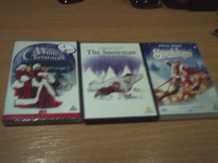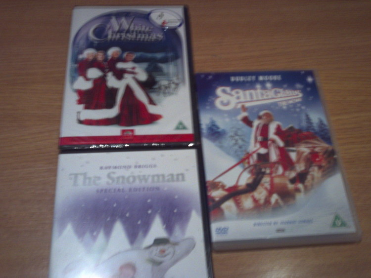 pack of 3 white christmas (unopened) the snowman(opened) and snata claus the movie (opened) all have discs in them :)
