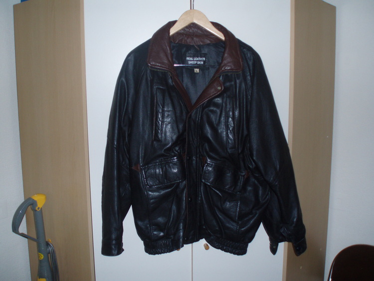 Mens real leather bomber type coat black with brown collars size L in very good condition