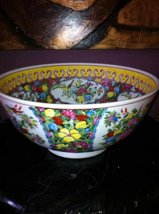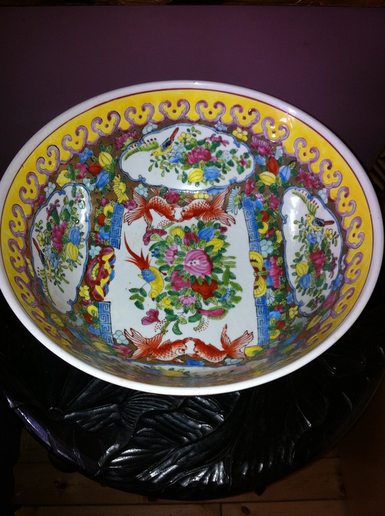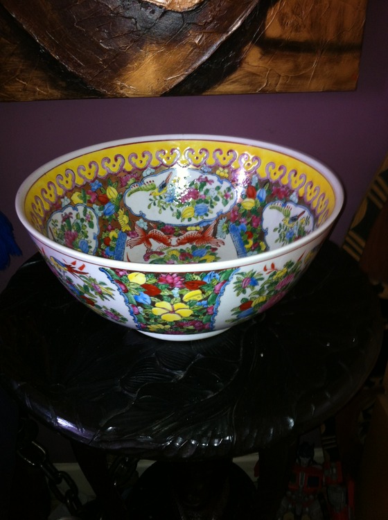 LARGE CHINESE FAMILLE ROSE PUNCH BOWL. THIS IS A GREAT PIECE IN FANTASTIC CONDITION NO CHIPS OR CRACKS AND RINGS AS CLEAR AS A BELL, IT STANDS 6" ( 15 CM ) HIGH X 12" ( 30 CM ) WIDE. IT IS EXTREMELY HEAVY PIECE. IT IS ALL BEAUTIFULLY HAND PAINTED WITH BIRDS, FISH, FLOWERS AND FOLIAGE IN LOVELY RUYI SCEPTER BORDERS AND PANELS, IT IS UNMARKED BUT I WOULD SAY FROM THE QUALITY OF THE PIECE 19th CENTURY