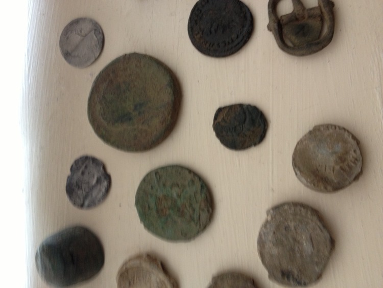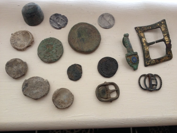 Metal detecting finds i have 2 hammerd coins 5 buckels with gold gild roman brooch bag seals roman coin ect.....