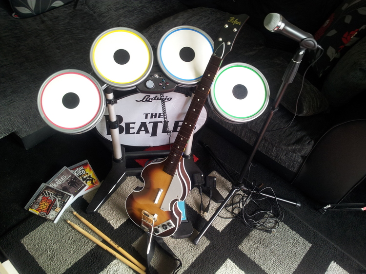 The Beatles band full set. Includes drum with sticks, guitar, mic and all the wireless plugs needed to play. Its coming with three games that are pictured. The whole thing is as new with just a few makes on the drum sticks. Its still got its box which I need to get from the roof. I am open to sensible offers and needs to go because of real drum and guitar purchace.
