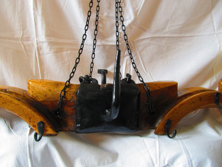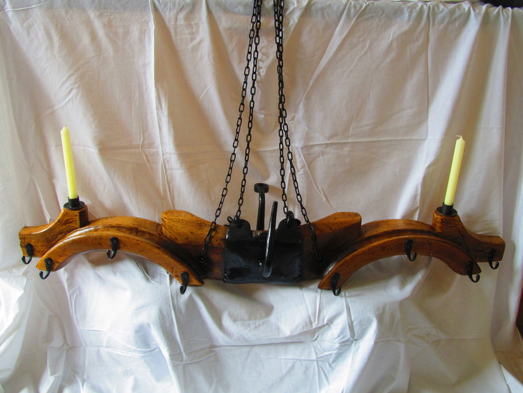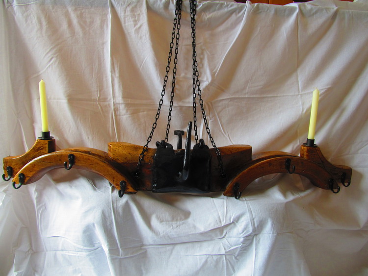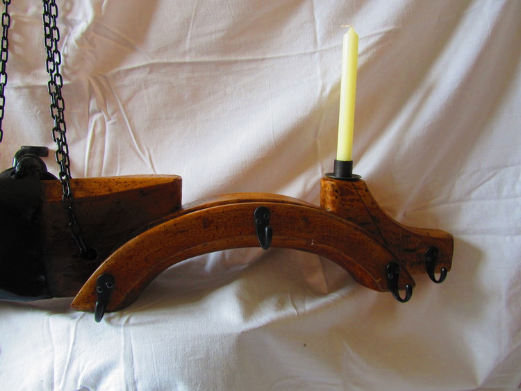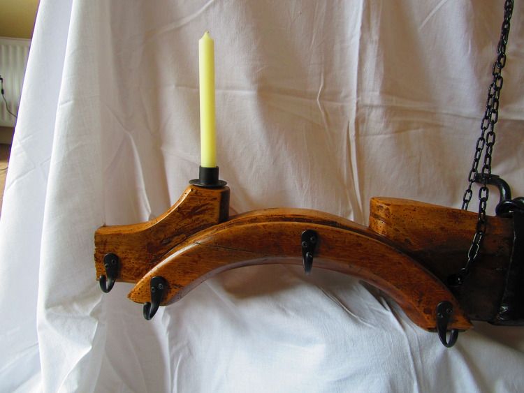 Antique Yoke that i brought in the Poitou-Charents region in France and have turned it into pots and pan holder for your country kitchen the chain comes with it and is strong enough to support your Pots ad pans as well as the yoke. It also has 2 standard size candle holders which has a practical use as well as looking nice.