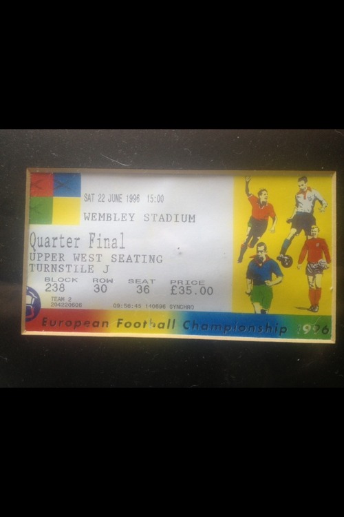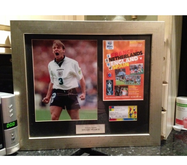 A signed Euro '96 Stuart Pearce plaque, professionally framed and consists of signed photo, match programme, and ticket. This comes with certificate of authenticity. This measures 28" x 21" valued at £300+