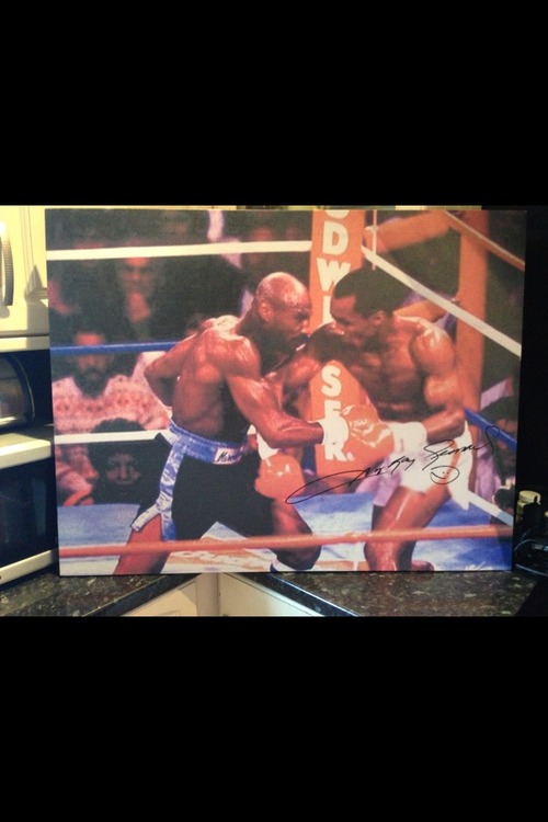 A hand signed Sugar Ray Leonard canvas, this measures 38" x 28" valued at £275+