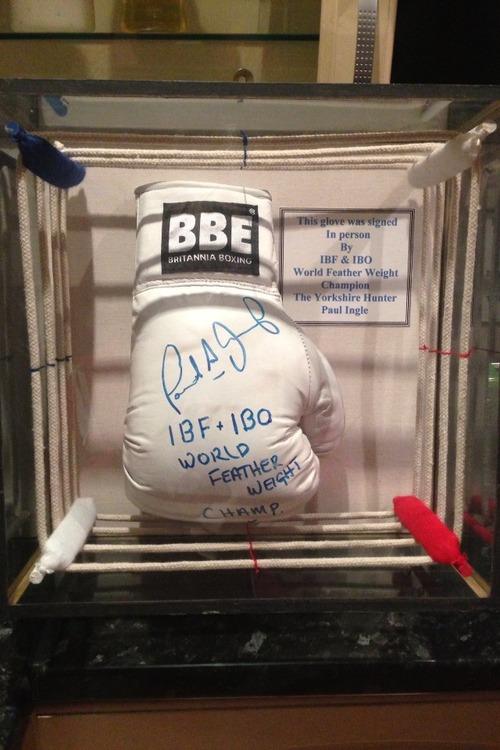 A signed Paul Ingle boxing glove,signed at the beginning of his last fight before his retirement( serious injury) it has been professionally framed in the style of a boxing ring, making this a one off piece. Comes with certificate of authenticity also. This measures 18" x 18" valued at £350+
