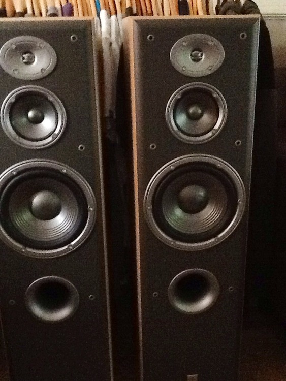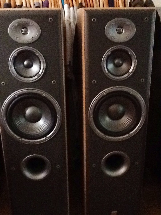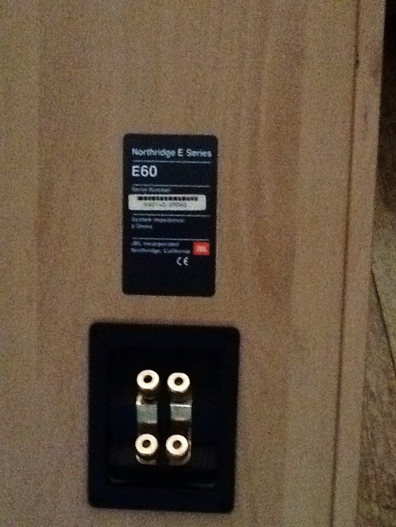 Here is my pair of JBL house speakers they are Northridge E Series E60s they are freestanding 3 way model they are 900mm high 300mm deep and 250mm wide. I have owned these speakers for about 12 years now and purchased them new although I can no longer find the paperwork for them. They have a few little scuffs here and there but very very few considering their age and times I have moved houses although they still sound as crisp and clear today as the day I purchased them. They have 2 gold plated inlet/outlet connection ports they are a real quality loud clear and crisp pair of speakers