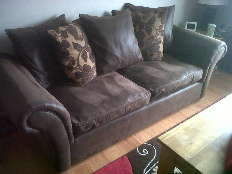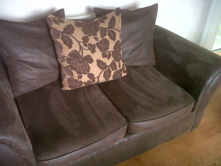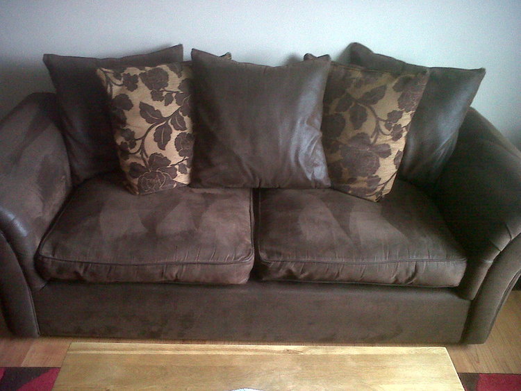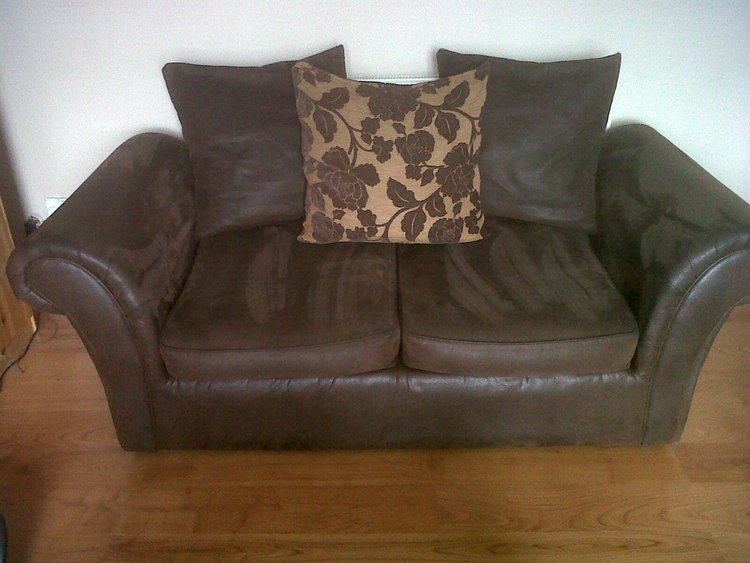 Faux suede effect (hard to explain he material) in good condition. only flaw is a small tear on the 2 seater behind the cushion so really no noticeable. Other than that no other marks I can see. Very comfy and easy to clean.