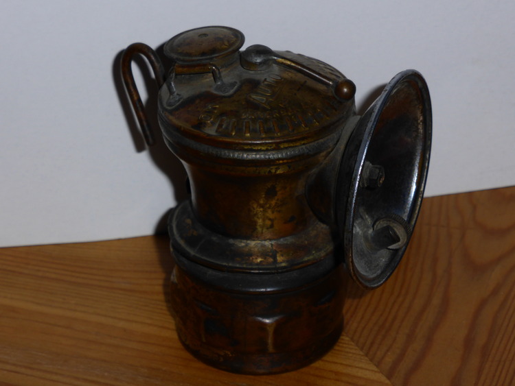 An old brass carbide miner's lamp in excellent condition. Calcium carbide was placed in the lower chamber and water in the upper. A controlled drip of water produced acetylene gas that provided the illuminating light without need of electricity.