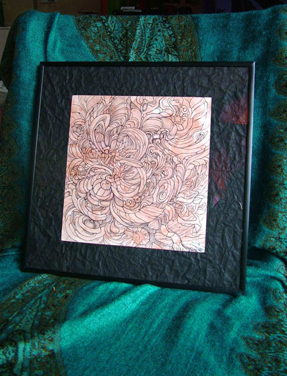 Framed in metallic, black frame. Black crisped paper on background.