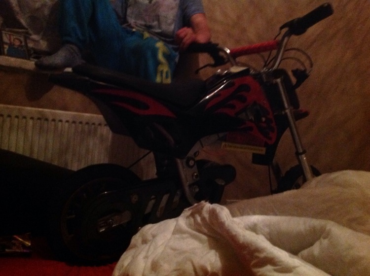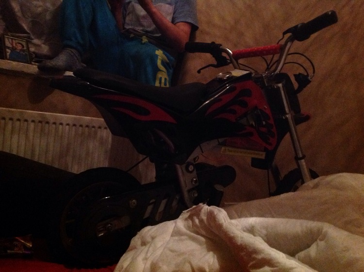 It's red and black with red flames up the sides it needs a few things doing to it I'm two big for it now. It's just had a brand new battery the charger ports broke so u charge it with two wires it's got the matching helmet with it the bike cost my mum 250 pound a few years ago it comes with one key and won't work with no key