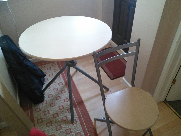 Round table with 4 matching folding chairs.