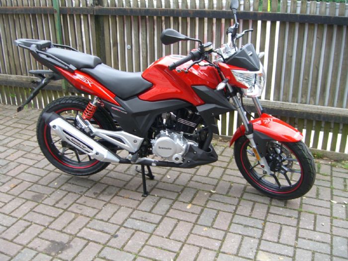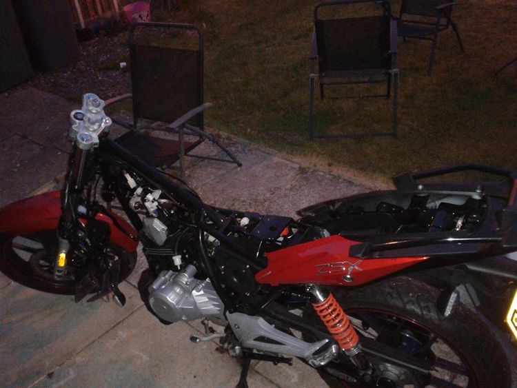 Lexmoto ZSX, 63 plate. Registered new November, only 300 miles on clock. Engine in full working order, needs a few bits to complete. Handlebar, Speedo clock, headlight, plastic fairings. Structurally and mechanically sound, could buy a handlebar for 35 quid and drive off if you wanted, seat and petrol tank taken off as tank dented, but come with bike and bolt on in five minutes. Open to reasonable offers. Estimated the parts for repair at about £300 from chinesemotorcycleparts.com, just can't be bothered fixing it. V5 present, comes with heavy lock and chain and rain cover. Also, had first service recently, which was stamped at dealership. Bike cost 1650 new November just gone and doesn't need M.O.T until 2017.