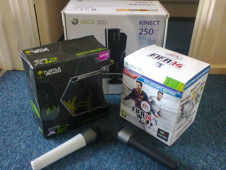 xbox 360 250g with kinect and 32 games 3 controllers and 2 mikes for lips and charger pack. all boxed great condition.turtle beach head set